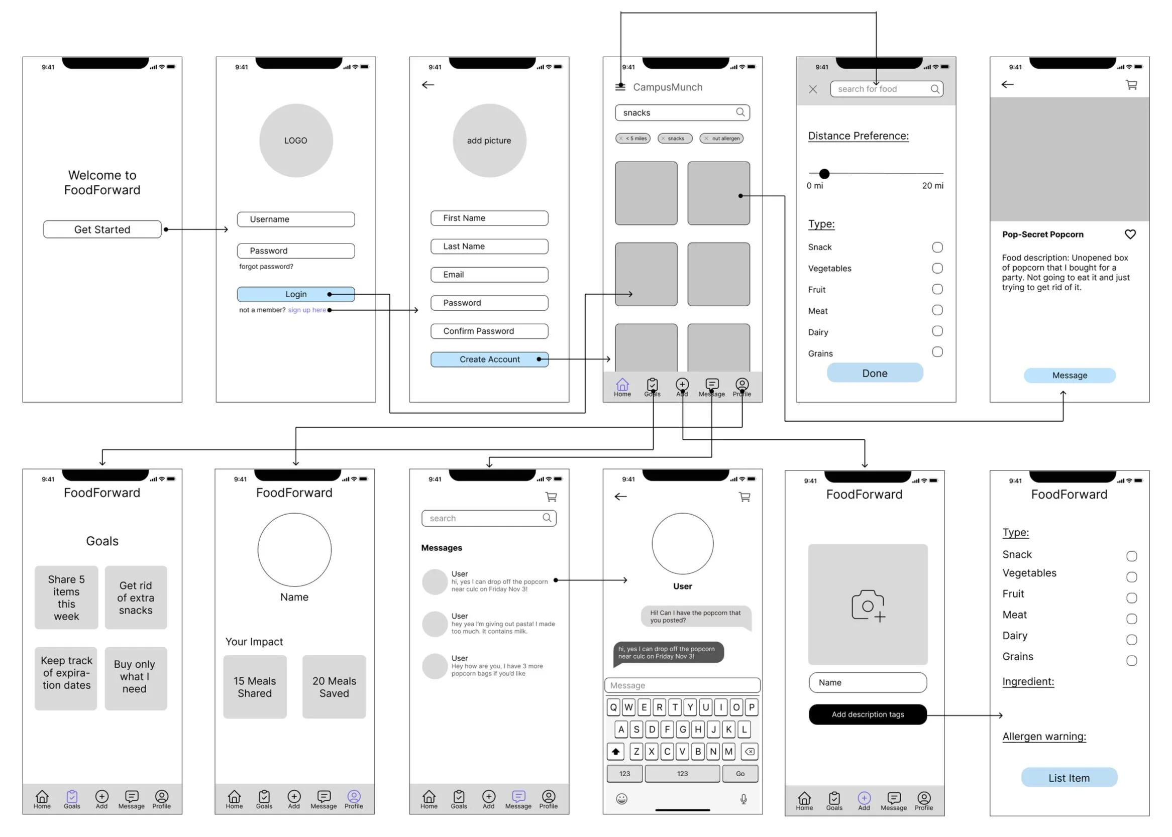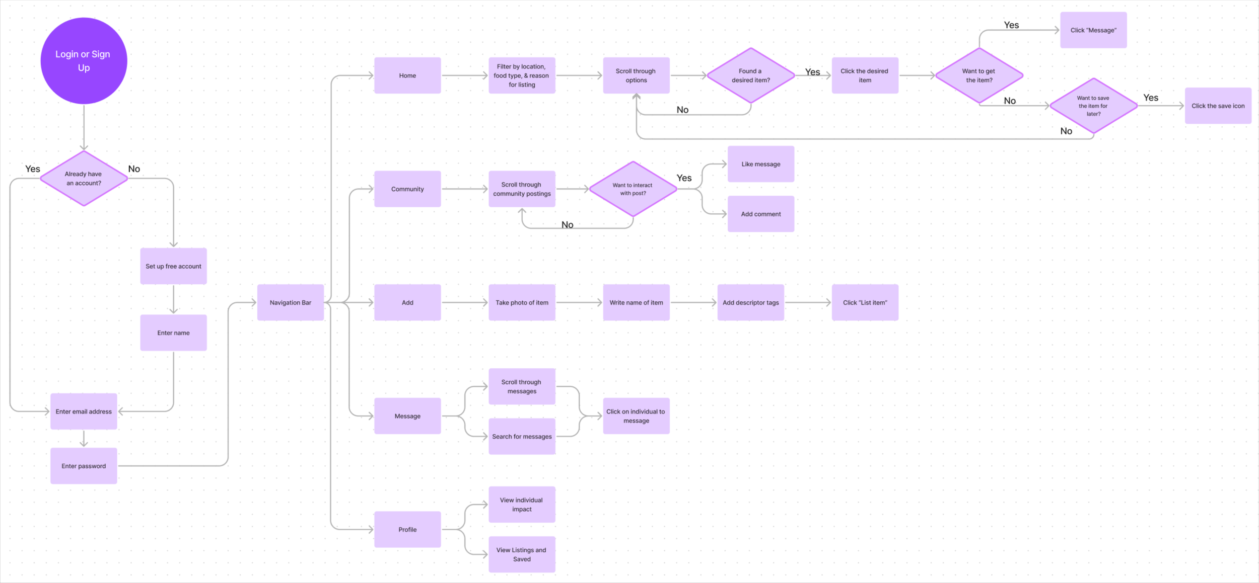 We wanted the app’s user flow to be intuitive and straightforward, ensuring that users can easily navigate through the app to complete their goals. This is a simple idea of the flow we wanted to accomplish for listing and searching for food.